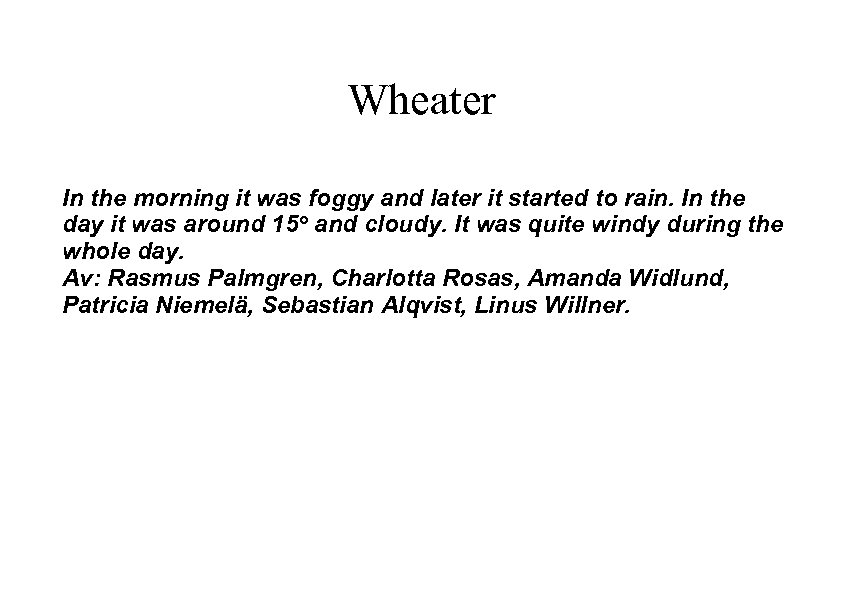 Wheater In the morning it was foggy and later it started to rain. In the day it was around 15° and cloudy. It was quite windy during the whole day. Av: Rasmus Palmgren, Charlotta Rosas, Amanda Widlund, Patricia Niemelä, Sebastian Alqvist, Linus Willner.