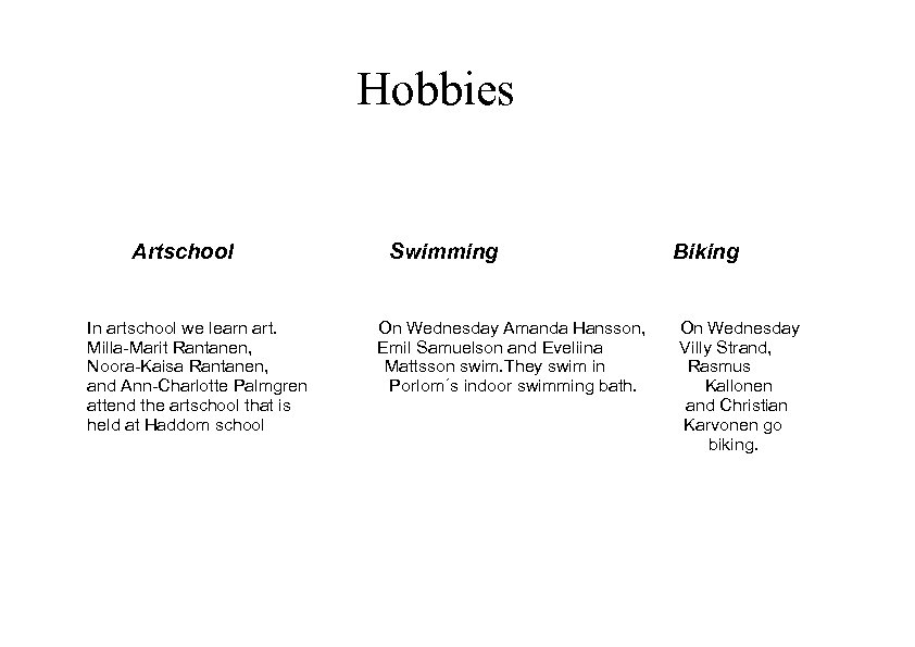 Hobbies Artschool In artschool we learn art. Milla-Marit Rantanen, Noora-Kaisa Rantanen, and Ann-Charlotte Palmgren attend the artschool that is held at Haddom school Swimming On Wednesday Amanda Hansson, Emil Samuelson and Eveliina Mattsson swim. They swim in Porlom´s indoor swimming bath. Biking On Wednesday Villy Strand, Rasmus Kallonen and Christian Karvonen go biking.