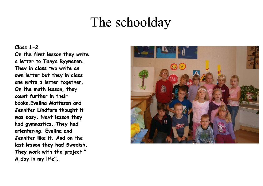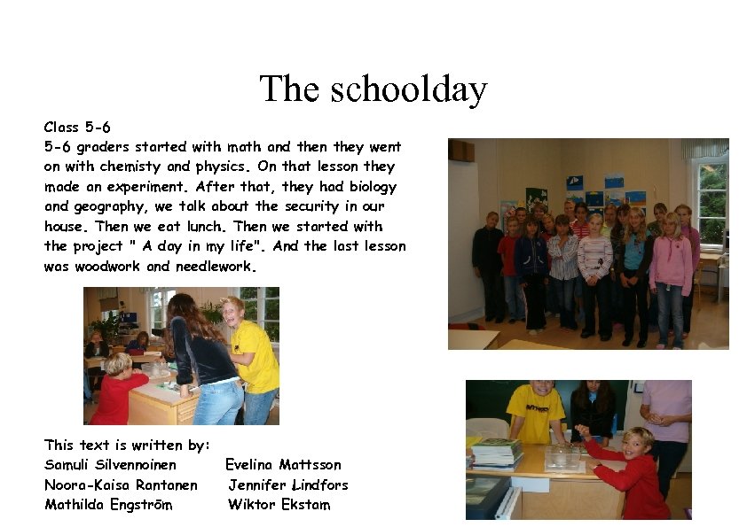 The schoolday Class 5 -6 graders started with math and then they went on with chemisty and physics. On that lesson they made an experiment. After that, they had biology and geography, we talk about the security in our house. Then we eat lunch. Then we started with the project " A day in my life". And the last lesson was woodwork and needlework. This text is written by: Samuli Silvennoinen Noora-Kaisa Rantanen Mathilda Engström Evelina Mattsson Jennifer Lindfors Wiktor Ekstam