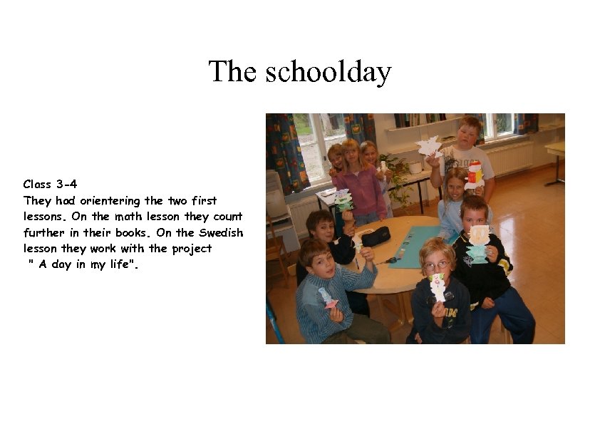 The schoolday Class 3 -4 They had orientering the two first lessons. On the math lesson they count further in their books. On the Swedish lesson they work with the project " A day in my life".