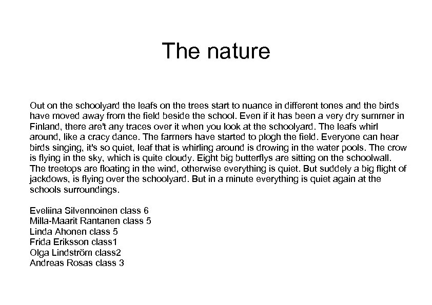 The nature Out on the schoolyard the leafs on the trees start to nuance in different tones and the birds have moved away from the field beside the school. Even if it has been a very dry summer in Finland, there are't any traces over it when you look at the schoolyard. The leafs whirl around, like a cracy dance. The farmers have started to plogh the field. Everyone can hear birds singing, it's so quiet, leaf that is whirling around is drowing in the water pools. The crow is flying in the sky, which is quite cloudy. Eight big butterflys are sitting on the schoolwall. The treetops are floating in the wind, otherwise everything is quiet. But suddely a big flight of jackdows, is flying over the schoolyard. But in a minute everything is quiet again at the schools surroundings. Eveliina Silvennoinen class 6 Milla-Maarit Rantanen class 5 Linda Ahonen class 5 Frida Eriksson class 1 Olga Lindström class 2 Andreas Rosas class 3
