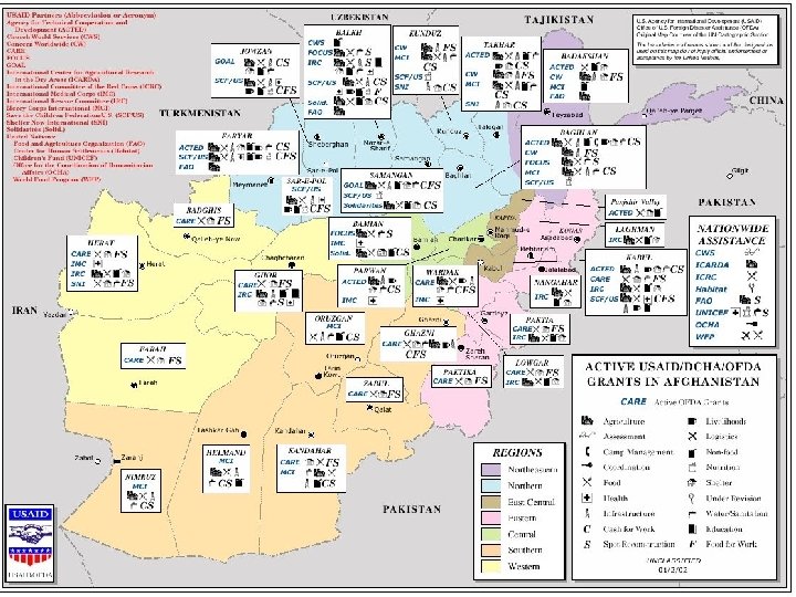 Major Donors: Examples of funding (Source: Relief. Web, 12 April 02. USDo. S: PRM) Agency Amount Total Purpose UNHCR TOTAL $54. 0 million Emergency Response to Afghan Refugees and IDPs; Support for Voluntary Repatriation and Reintegration for Returning Refugees ICRC TOTAL $13. 5 million Emergency Response for Conflict Victims in Afghanistan and neighboring countries OCHA TOTAL $3. 6 million Inter-Agency Coordination in Pakistan and AFG IOM TOTAL $3. 0 million Emergency Assistance, Logistics, Assistance to IDPs and Returning Refugees in Afghanistan WFP TOTAL $5. 5 million Logistics, Food Mgmt & Supply in Afghanistan and Pakistan UNICEF TOTAL $6. 0 million Emergency Health, Education, Wat/San Assistance to Afghan Refugees and IDPs; Support for UNICEF's Back-to-School Program for Returning Afghan Refugees WHO TOTAL $1. 0 million Support for the Provision of Basic Health Services for Returning Refugees Mercy Corps (MCI) $0. 16 million Support to Maintain Operational Capacity Inside Afghanistan (October-December 2001)