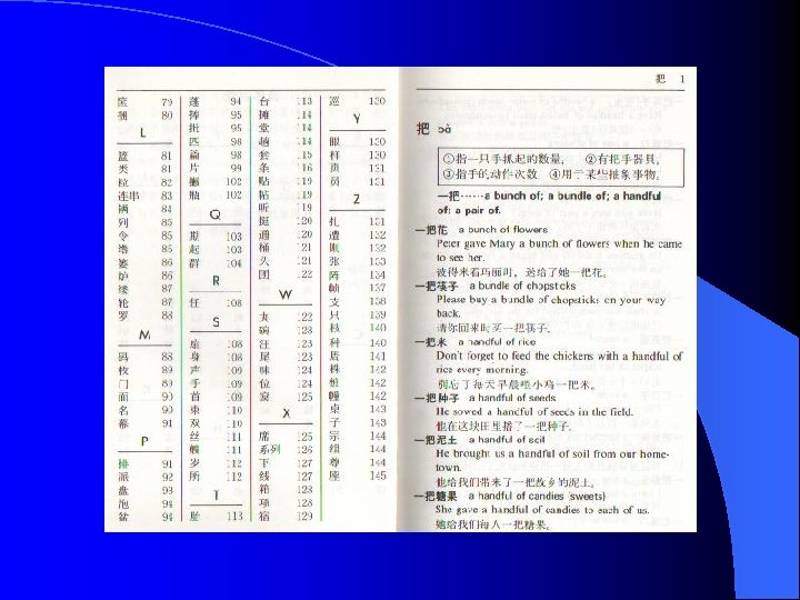 Grammar l Topic-prominent l No inflection l The word order is important S+V+O l The use of measure words (classifiers) l Left-branching