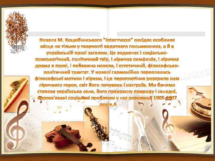 -Що означає слово «Intermezzo» ? «Перепочинок» , «пауза» . У музиці це інструментальна п’єса довільної будови або окремий епізод в опері. - Як пов’язана назва новели з її змістом? Назва твору дуже влучна. Під нею ми розуміємо перерву в творчості, насолоду музикою природи. Отже, новела «Intermezzo» сприймається як автобіографічний твір.