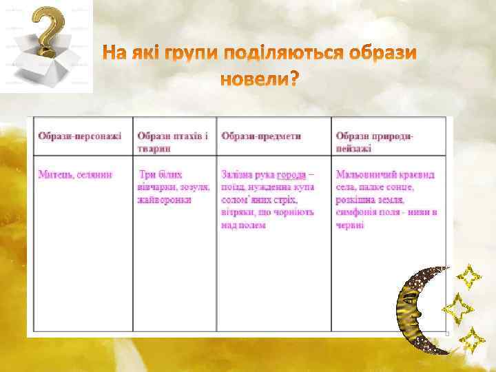 -Яка роль Кононівських полів? Чим вони допомагали митцеві? Кононівські поля стали тією ланкою у ланцюгу життя, яку письменник влучно назвав « Intermezzo» . Саме вони принесли герою твору заспокоєння. Лише у природі є гармонія, якої постійно шукає людина. Стрес, депресію можна перемогти, зцілити – для цього потрібно йти до природи. - Яка розв’язка новели? Яка основна думка твору? Людина не може бути самотньою. Завдання митця – служити своєю творчістю народові: «Йду між люди. Душа готова, струни тугі, вона вже грає» .