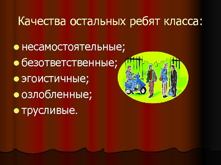 Качества остальных ребят класса: l несамостоятельные; l безответственные; l эгоистичные; l озлобленные; l трусливые.