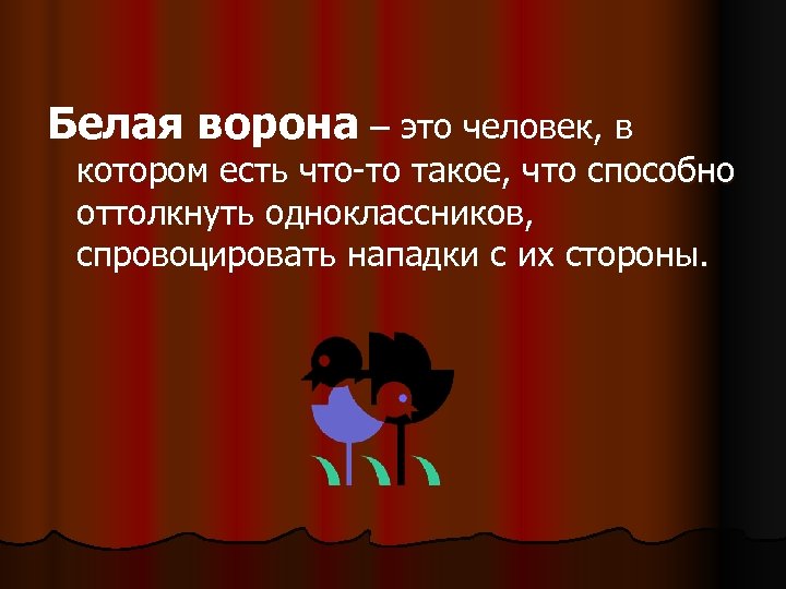 Белая ворона – это человек, в котором есть что-то такое, что способно оттолкнуть одноклассников, спровоцировать нападки с их стороны.