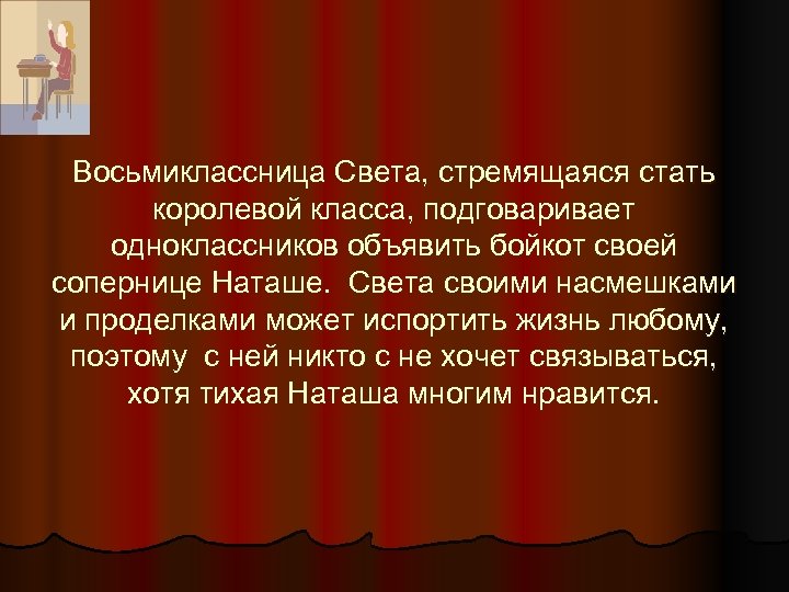 Восьмиклассница Света, стремящаяся стать королевой класса, подговаривает одноклассников объявить бойкот своей сопернице Наташе. Света своими насмешками и проделками может испортить жизнь любому, поэтому с ней никто с не хочет связываться, хотя тихая Наташа многим нравится.