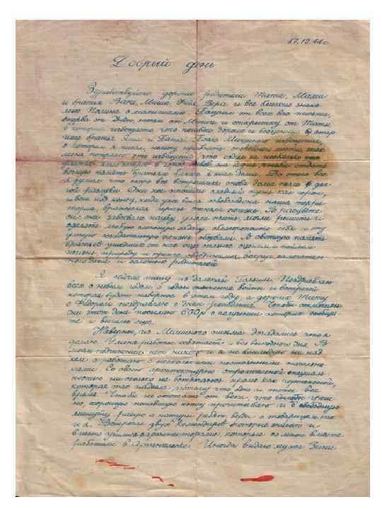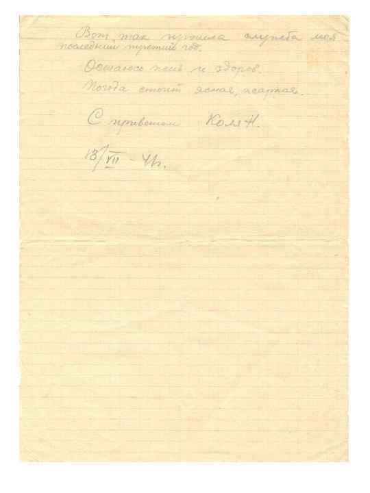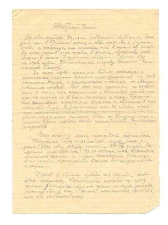 Отрывок из письма. Июль 1941 года. Добрый день. Здравствуйте дорогие родители и братья. Вот уже как с 27 июля покинул свой город, где я служил 3 года и нахожусь на колесах, в пути на поезде. За этот период дни провел в вагоне, несколько дней обитал в лесах Смоленской области. Сейчас еду не знаю куда. За этот путь пришлось видеть эшелоны с ранеными, налеты фашистских самолетов на жд станции, вагоны с женщинами и детьми из эвакуированных городов. Все это еще пустяки по сравнению с тем, что произошло с эшелоном нашей части, но только не в том котором я ехал. Германские самолеты обстреляли эшелон и сбросили в него несколько бомб. Так не вступив лицо с лицом врага можно быть неожиданной варварской жертвой. Вот так прошла служба моя последний третий год. Остаюсь жив и здоров. С приветом Коля.