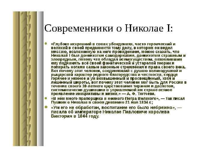 • Николай поставил себе задачей ничего не переменять, не вводить ничего нового в основаниях, а только поддерживать существующий порядок, восполнять пробелы, чинить обнаружившиеся ветхости помощью практического законодательства и все это делать без всякого участия общества, даже с подавлением общественной самостоятельности, одними правительственными средствами; но он не снял с очереди тех жгучих вопросов, которые были поставлены в прежнее царствование, и, кажется, понимал их жгучесть ещё сильнее, чем его предшественник (Н. О. Ключевский)