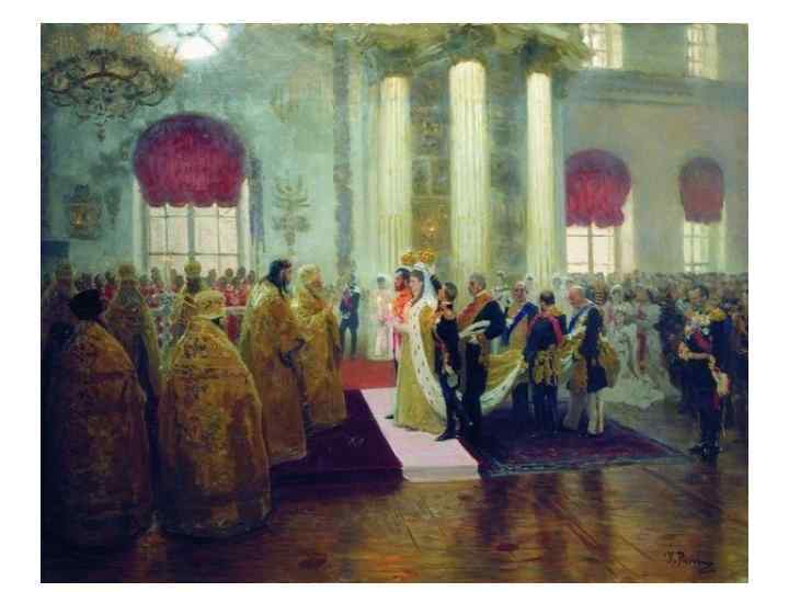 Первые шаги и коронация • Спустя несколько дней по кончине Александра III (20 октября 1894 года) и своего вступления на престол (высочайший манифест обнародован 21 октября; в тот же день приносилась присяга сановниками, чиновниками, придворными и в войсках), 14 ноября 1894 года в Большой церкви Зимнего дворца сочетался браком с Александрой Фёдоровной; медовый месяц проходил в атмосфере панихид и траурных визитов.