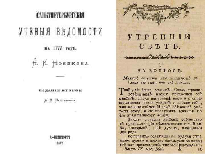 Журналы, издававшиеся Новиковым В 1777 Новиков выпустил 22 номера еженедельных «Санкт-Петербургских учёных ведомостей» . Это был журнал учёной и литературной критики, ставивший себе целью, с одной стороны, сблизить русскую литературу и науку с учёным миром Запада, с другой — выставлять заслуги отечественных писателей. Его считают первым русским журналом критической библиографии. Прекратив «Ведомости» , Новиков начал издавать журнал «Утренний Свет» (1777— 1780) «Утренний Свет» считается первым в России философским журналом.