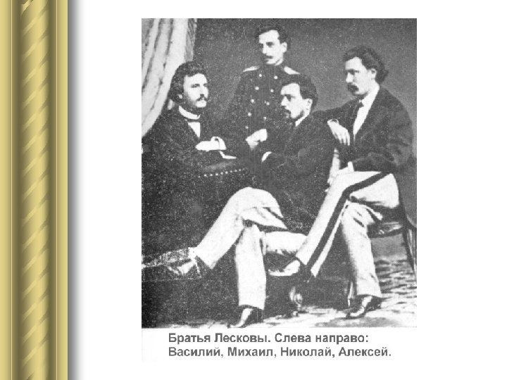 l Псевдонимы Н. С. Лескова l В начале творческой деятельности Лесков писал под псевдонимом М. Стебни цкий. Псевдонимная подпись «Стебницкий» впервые появилась 25 марта 1862 года под первой беллетристической работой — «Погасшее дело» (позже «Засуха» ). Держалась она до 14 августа 1869 года. Временами проскальзывали подписи «М. С» , «С» , и, наконец, в 1872 году. «Л. С» , «П. Лесков-Стебницкий» и «М. Лесков-Стебницкий» . Среди других условных подписей и псевдонимов, использовавшихся Лесковым, известны: «Фрейшиц» , «В. Пересветов» , «Николай Понукалов» , «Николай Горохов» , «Кто-то» , «Дм. М-ев» , «Н. » , «Член общества» , «Псаломщик» , «Свящ. П. Касторский» , «Дивьянк» , «М. П. » , «Б. Протозанов» , «Николай--ов» , «Н. Л. --в» , «Любитель старины» , «Проезжий» , «Любитель часов» , «N. L. » , «Л. »