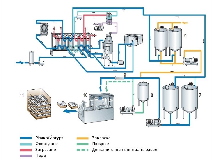 Технологична схема при производството на киселото мляко • • • • • • • Окачествяване и приемане Охлаждане Стандартизация по масленост Сепараторно очистване(40 -45 C) Хомогенизация при 65 С Пастьоризация 93 -95 С със задръжка 20 -30 min Охлаждане до температура на заквасване(43 -45 С) Добавяне на закваска от Lactobacillus delbrueckii subsp. bulgaricus и Streptococcus Thermophilus в количество 2% Разфасоване Термостатиране(t=42 -43 C за 2. 5 -3 h до достигане на киселиност 65 -75 Т) Охлаждане на вече коагулиралото мляко: 1. От 42 -43 C до 20 -25 C 2. От 20 -25 С до 4 -6 С Хладилно съхранение при 4 -6 С за 10 дни