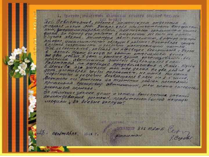 Никто не забыт и ни что не забыто Легкой поступью шагая, Май Победу подарил! И сегодня вспоминаем, Кто от зла нас защитил! Вам здоровья, ветераны, Пусть не рвется счастья нить! Подвиг ваш на поле бранном Никогда нам не забыть! Бахонко Филипп Данилович Севастьянов Василий Николаевич