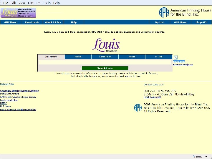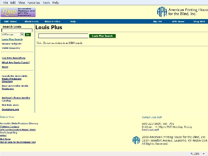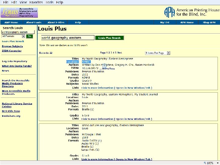 NIMAC and Beyond: Leveraging Existing Solutions • Louis: locate and share existing AIM from 140 agencies • Louis Plus: locate NIMAS, AIM • APH File Repository: share value-added electronic AIM (BRF and beyond) • AMP Database: locate AMP professionals in braille, NEMETH, computer braille, music, graphics and more • TGIL: share tactile graphics