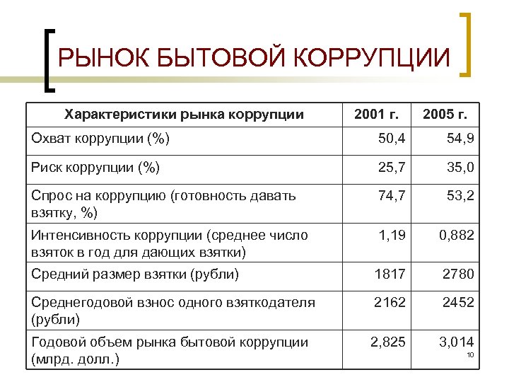 РЫНОК БЫТОВОЙ КОРРУПЦИИ Характеристики рынка коррупции 2001 г. 2005 г. Охват коррупции (%) 50, 4 54, 9 Риск коррупции (%) 25, 7 35, 0 Спрос на коррупцию (готовность давать взятку, %) 74, 7 53, 2 Интенсивность коррупции (среднее число взяток в год для дающих взятки) 1, 19 0, 882 Средний размер взятки (рубли) 1817 2780 Среднегодовой взнос одного взяткодателя (рубли) 2162 2452 Годовой объем рынка бытовой коррупции (млрд. долл. ) 2, 825 3, 014 10