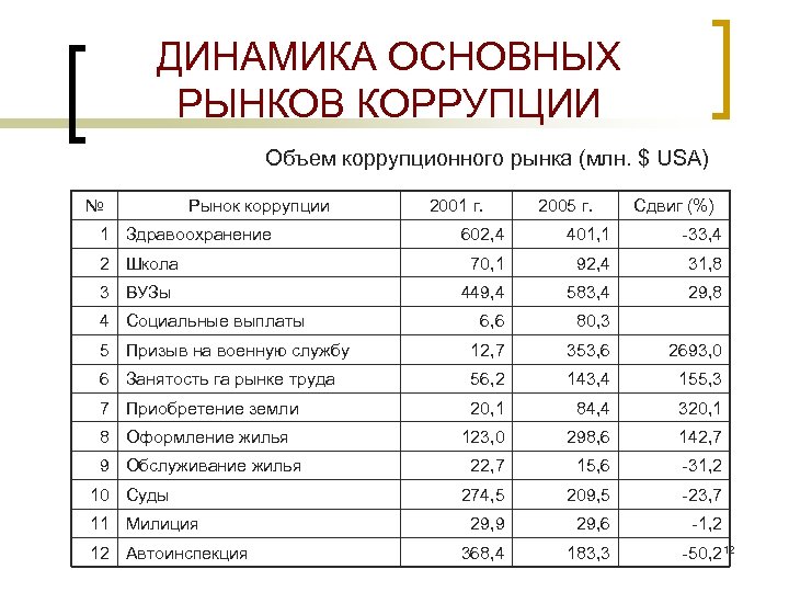 ДИНАМИКА ОСНОВНЫХ РЫНКОВ КОРРУПЦИИ Объем коррупционного рынка (млн. $ USA) № Рынок коррупции 1 Здравоохранение 2001 г. 2005 г. Сдвиг (%) 602, 4 401, 1 -33, 4 2 Школа 70, 1 92, 4 31, 8 3 ВУЗы 449, 4 583, 4 29, 8 6, 6 80, 3 5 Призыв на военную службу 12, 7 353, 6 2693, 0 6 Занятость га рынке труда 56, 2 143, 4 155, 3 7 Приобретение земли 20, 1 84, 4 320, 1 8 Оформление жилья 123, 0 298, 6 142, 7 22, 7 15, 6 -31, 2 274, 5 209, 5 -23, 7 29, 9 29, 6 -1, 2 368, 4 183, 3 -50, 2 12 4 Социальные выплаты 9 Обслуживание жилья 10 Суды 11 Милиция 12 Автоинспекция