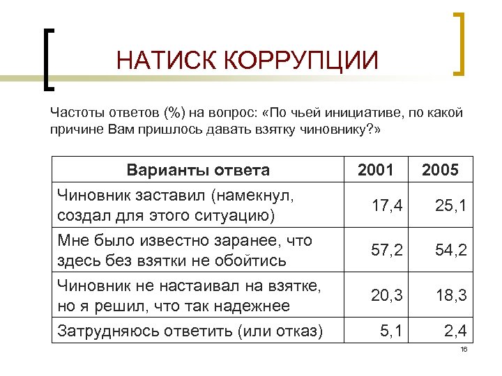 НАТИСК КОРРУПЦИИ Частоты ответов (%) на вопрос: «По чьей инициативе, по какой причине Вам пришлось давать взятку чиновнику? » Варианты ответа Чиновник заставил (намекнул, создал для этого ситуацию) Мне было известно заранее, что здесь без взятки не обойтись Чиновник не настаивал на взятке, но я решил, что так надежнее Затрудняюсь ответить (или отказ) 2001 2005 17, 4 25, 1 57, 2 54, 2 20, 3 18, 3 5, 1 2, 4 16