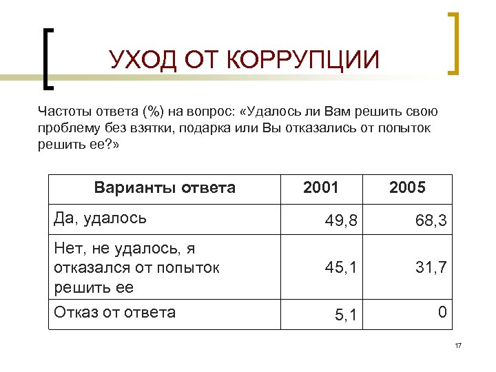 УХОД ОТ КОРРУПЦИИ Частоты ответа (%) на вопрос: «Удалось ли Вам решить свою проблему без взятки, подарка или Вы отказались от попыток решить ее? » Варианты ответа 2001 2005 Да, удалось 49, 8 68, 3 Нет, не удалось, я отказался от попыток решить ее 45, 1 31, 7 5, 1 0 Отказ от ответа 17