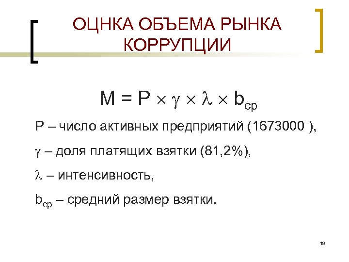 ОЦНКА ОБЪЕМА РЫНКА КОРРУПЦИИ М = P bcp P – число активных предприятий (1673000 ), – доля платящих взятки (81, 2%), – интенсивность, bcp – средний размер взятки. 19