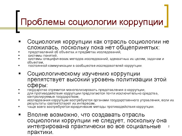 Проблемы социологии коррупции § Социология коррупции как отрасль социологии не сложилась, поскольку пока нет общепринятых: § § представлений об объектах и предметах исследований, системы понятий, системы специфических методов исследований, адекватных их целям, задачам и объектам, постоянной коммуникации в сообществе исследователей коррупции. § Социологическому изучению коррупции препятствует высокий уровень политизации этой сферы: § § государство стремится монополизировать представления о коррупции, для противодействия коррупции предлагаются почти исключительно средства, контролируемые государством, исследования коррупции востребуются органами государственного управления, если их результаты соответствуют их интересам, чаще всего востребуются юридические методы противодействия коррупции. § Вполне возможно, что создавать отрасль социологии коррупции не следует, поскольку она интегрирована практически во все социальные 2 практики.