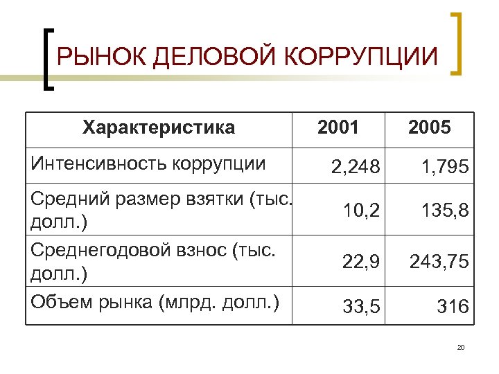 РЫНОК ДЕЛОВОЙ КОРРУПЦИИ Характеристика Интенсивность коррупции Средний размер взятки (тыс. долл. ) Среднегодовой взнос (тыс. долл. ) Объем рынка (млрд. долл. ) 2001 2005 2, 248 1, 795 10, 2 135, 8 22, 9 243, 75 33, 5 316 20