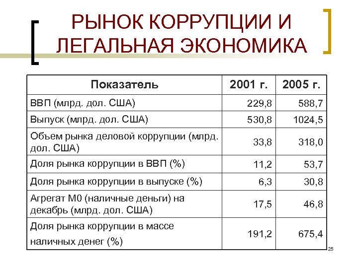 РЫНОК КОРРУПЦИИ И ЛЕГАЛЬНАЯ ЭКОНОМИКА Показатель 2001 г. 2005 г. ВВП (млрд. дол. США) 229, 8 588, 7 Выпуск (млрд. дол. США) 530, 8 1024, 5 Объем рынка деловой коррупции (млрд. дол. США) 33, 8 318, 0 Доля рынка коррупции в ВВП (%) 11, 2 53, 7 6, 3 30, 8 17, 5 46, 8 191, 2 675, 4 Доля рынка коррупции в выпуске (%) Агрегат М 0 (наличные деньги) на декабрь (млрд. дол. США) Доля рынка коррупции в массе наличных денег (%) 25