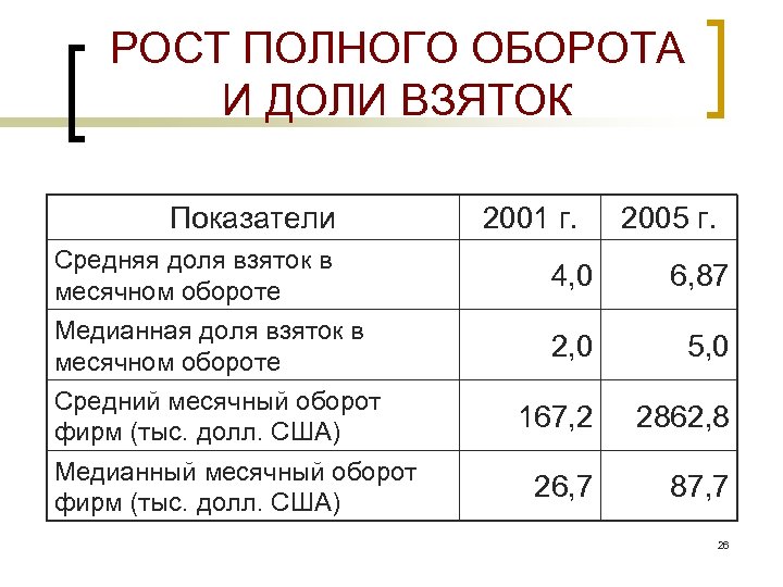 РОСТ ПОЛНОГО ОБОРОТА И ДОЛИ ВЗЯТОК Показатели 2001 г. 2005 г. Средняя доля взяток в месячном обороте 4, 0 6, 87 Медианная доля взяток в месячном обороте 2, 0 5, 0 167, 2 2862, 8 26, 7 87, 7 Средний месячный оборот фирм (тыс. долл. США) Медианный месячный оборот фирм (тыс. долл. США) 26