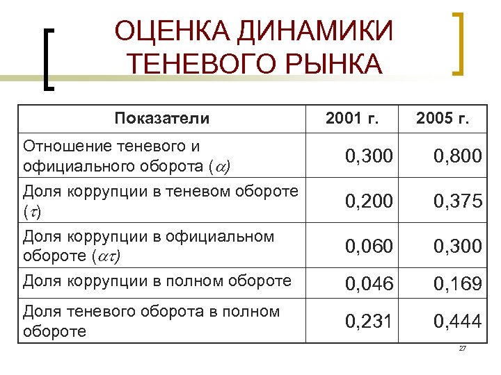 ОЦЕНКА ДИНАМИКИ ТЕНЕВОГО РЫНКА Показатели Отношение теневого и официального оборота ( ) Доля коррупции в теневом обороте ( ) Доля коррупции в официальном обороте ( ) Доля коррупции в полном обороте Доля теневого оборота в полном обороте 2001 г. 2005 г. 0, 300 0, 800 0, 200 0, 375 0, 060 0, 300 0, 046 0, 169 0, 231 0, 444 27
