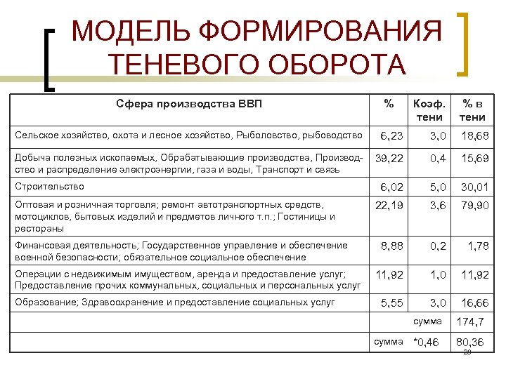 МОДЕЛЬ ФОРМИРОВАНИЯ ТЕНЕВОГО ОБОРОТА Сфера производства ВВП % Коэф. тени %в тени Сельское хозяйство, охота и лесное хозяйство, Рыболовство, рыбоводство 6, 23 3, 0 18, 68 Добыча полезных ископаемых, Обрабатывающие производства, Производство и распределение электроэнергии, газа и воды, Транспорт и связь 39, 22 0, 4 15, 69 6, 02 5, 0 30, 01 22, 19 3, 6 79, 90 8, 88 0, 2 1, 78 11, 92 1, 0 11, 92 5, 55 3, 0 16, 66 Строительство Оптовая и розничная торговля; ремонт автотранспортных средств, мотоциклов, бытовых изделий и предметов личного т. п. ; Гостиницы и рестораны Финансовая деятельность; Государственное управление и обеспечение военной безопасности; обязательное социальное обеспечение Операции с недвижимым имуществом, аренда и предоставление услуг; Предоставление прочих коммунальных, социальных и персональных услуг Образование; Здравоохранение и предоставление социальных услуг сумма 174, 7 *0, 46 80, 36 28