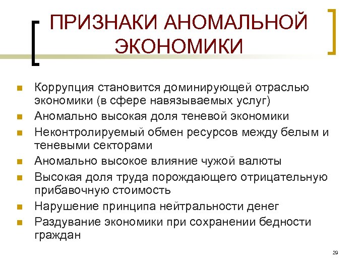ПРИЗНАКИ АНОМАЛЬНОЙ ЭКОНОМИКИ n n n n Коррупция становится доминирующей отраслью экономики (в сфере навязываемых услуг) Аномально высокая доля теневой экономики Неконтролируемый обмен ресурсов между белым и теневыми секторами Аномально высокое влияние чужой валюты Высокая доля труда порождающего отрицательную прибавочную стоимость Нарушение принципа нейтральности денег Раздувание экономики при сохранении бедности граждан 29