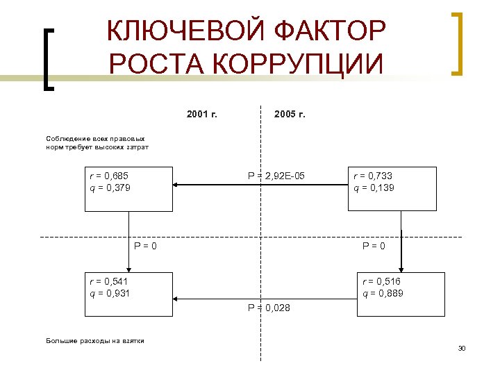КЛЮЧЕВОЙ ФАКТОР РОСТА КОРРУПЦИИ 2001 г. 2005 г. Соблюдение всех правовых норм требует высоких затрат r = 0, 685 q = 0, 379 P = 2, 92 E-05 P=0 r = 0, 733 q = 0, 139 P=0 r = 0, 516 q = 0, 889 r = 0, 541 q = 0, 931 P = 0, 028 Большие расходы на взятки 30