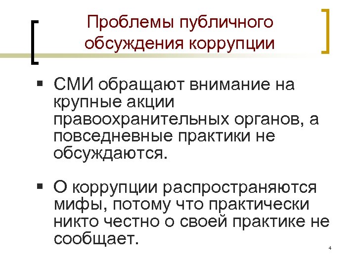Проблемы публичного обсуждения коррупции § СМИ обращают внимание на крупные акции правоохранительных органов, а повседневные практики не обсуждаются. § О коррупции распространяются мифы, потому что практически никто честно о своей практике не сообщает. 4