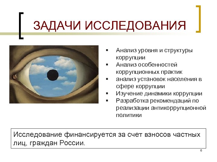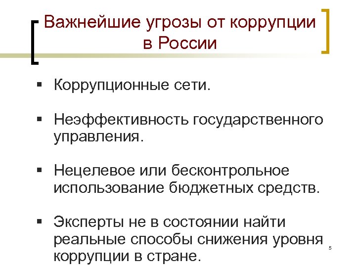 Важнейшие угрозы от коррупции в России § Коррупционные сети. § Неэффективность государственного управления. § Нецелевое или бесконтрольное использование бюджетных средств. § Эксперты не в состоянии найти реальные способы снижения уровня коррупции в стране. 5