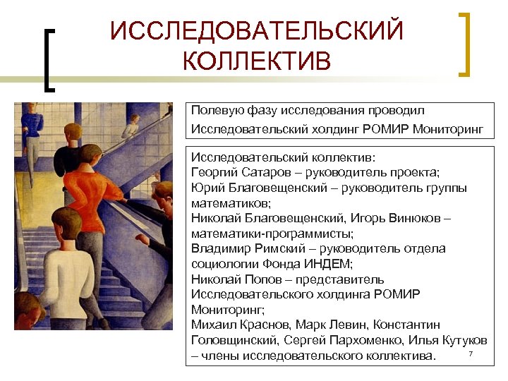 ИССЛЕДОВАТЕЛЬСКИЙ КОЛЛЕКТИВ Полевую фазу исследования проводил Исследовательский холдинг РОМИР Мониторинг Исследовательский коллектив: Георгий Сатаров – руководитель проекта; Юрий Благовещенский – руководитель группы математиков; Николай Благовещенский, Игорь Винюков – математики-программисты; Владимир Римский – руководитель отдела социологии Фонда ИНДЕМ; Николай Попов – представитель Исследовательского холдинга РОМИР Мониторинг; Михаил Краснов, Марк Левин, Константин Головщинский, Сергей Пархоменко, Илья Кутуков 7 – члены исследовательского коллектива.