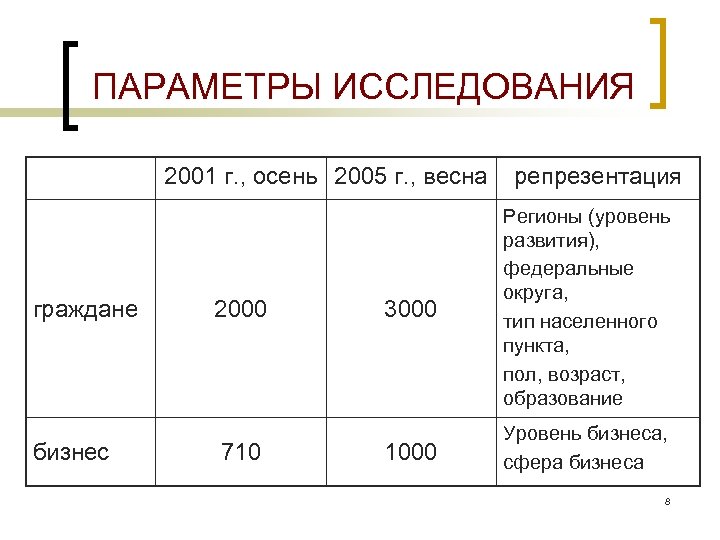 ПАРАМЕТРЫ ИССЛЕДОВАНИЯ 2001 г. , осень 2005 г. , весна граждане бизнес 2000 710 репрезентация 3000 Регионы (уровень развития), федеральные округа, тип населенного пункта, пол, возраст, образование 1000 Уровень бизнеса, сфера бизнеса 8