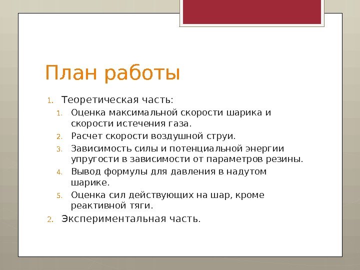 План работы 1. Теоретическая часть: 1. Оценка максимальной скорости шарика и скорости истечения газа. 2. Расчет скорости воздушной струи. 3. Зависимость силы и потенциальной энергии упругости в зависимости от параметров резины. 4. Вывод формулы для давления в надутом шарике. 5. Оценка сил действующих на шар, кроме реактивной тяги. 2. Экспериментальная часть.