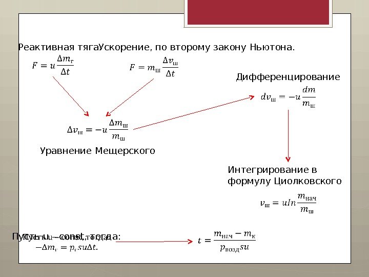 Реактивная тяга. Ускорение, по второму закону Ньютона. Уравнение Мещерского Дифференцирование Интегрирование в формулу Циолковского Пусть u – const, тогда: