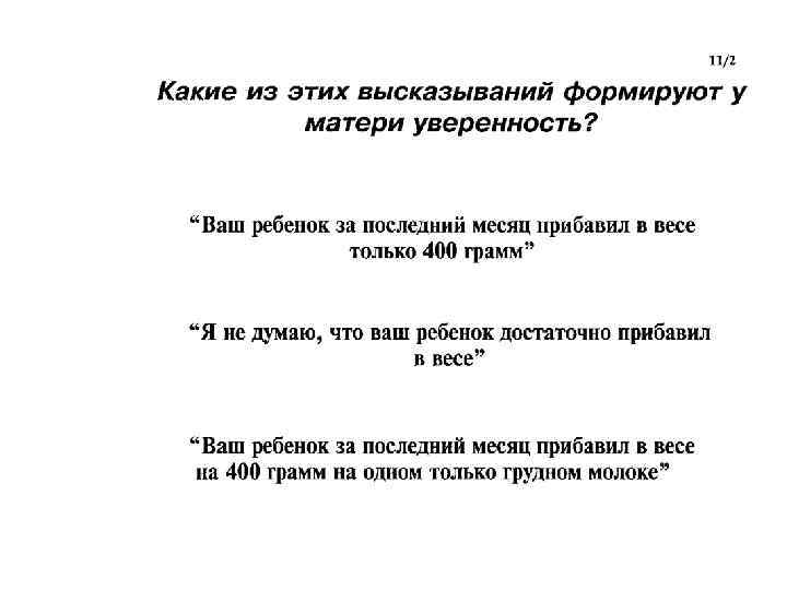 9. НЕ ДАВАТЬ МЛАДЕНЦАМ, НАХОДЯЩИМСЯ НА ГРУДНОМ ВСКАРМЛИВАНИИ, БУТЫЛОЧКИ С СОСКОЙ ИЛИ ПУСТЫШКИ Из 10 случайно отобранных матерей не менее 80% сообщают, что они не пользуются сосками и пустышками n На протяжении 2 -х часов наблюдения в поликлинике отмечается не более 2 -х случаев пользования сосками или пустышками n