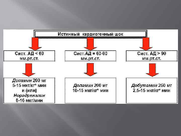 Лечение кардиогенного шока Кардиогенный шок - грозное осложнение инфаркта миокарда, летальность при котором достигает 80 % и более. Лечение его представляет сложную задачу и включает комплекс мероприятий, направленных на защиту ишемизированного миокарда и восстановление его функций, устранение микроциркуляторных нарушений, компенсацию нарушенных функций паренхиматозных органов. Эффективность лечебных мероприятий при этом во многом зависит от времени их начала. Раннее начало лечения кардиогенного шока является залогом успеха. Главная задача, которую необходимо решить как можно скорее, - это стабилизация артериального давления на уровне, обеспечивающем адекватную перфузию жизненно важных органов (90 -100 мм рт. ст. ).