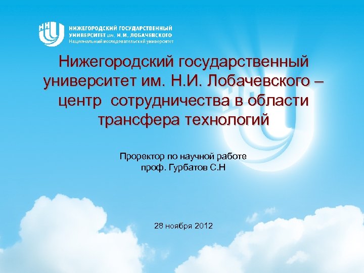 Нижегородский государственный университет им. Н. И. Лобачевского – центр сотрудничества в области трансфера технологий Проректор по научной работе проф. Гурбатов С. Н 28 ноября 2012