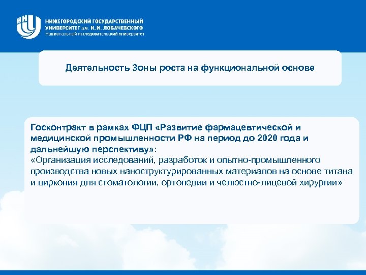 Деятельность Зоны роста на функциональной основе Госконтракт в рамках ФЦП «Развитие фармацевтической и медицинской промышленности РФ на период до 2020 года и дальнейшую перспективу» : «Организация исследований, разработок и опытно-промышленного производства новых наноструктурированных материалов на основе титана и циркония для стоматологии, ортопедии и челюстно-лицевой хирургии»