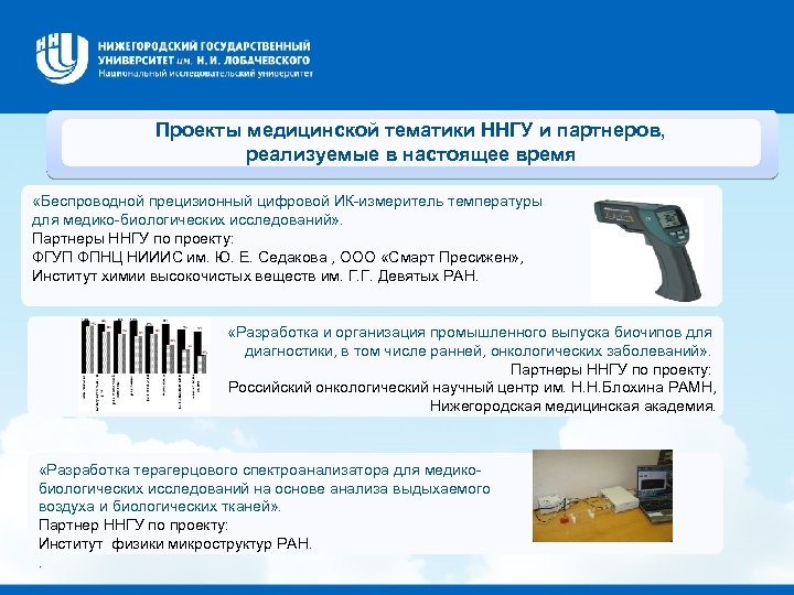 Проекты медицинской тематики ННГУ и партнеров, реализуемые в настоящее время «Беспроводной прецизионный цифровой ИК-измеритель температуры для медико-биологических исследований» . Партнеры ННГУ по проекту: ФГУП ФПНЦ НИИИС им. Ю. Е. Седакова , ООО «Смарт Пресижен» , Институт химии высокочистых веществ им. Г. Г. Девятых РАН. «Разработка и организация промышленного выпуска биочипов для диагностики, в том числе ранней, онкологических заболеваний» . Партнеры ННГУ по проекту: Российский онкологический научный центр им. Н. Н. Блохина РАМН, Нижегородская медицинская академия. «Разработка терагерцового спектроанализатора для медикобиологических исследований на основе анализа выдыхаемого воздуха и биологических тканей» . Партнер ННГУ по проекту: Институт физики микроструктур РАН. .