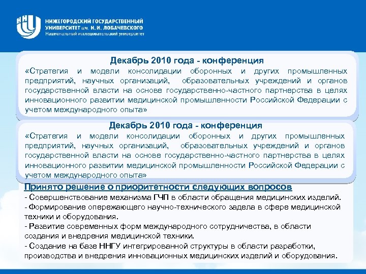 Декабрь 2010 года - конференция «Стратегия и модели консолидации оборонных и других промышленных предприятий, научных организаций, образовательных учреждений и органов государственной власти на основе государственно-частного партнерства в целях инновационного развитии медицинской промышленности Российской Федерации с учетом международного опыта» Принято решение о приоритетности следующих вопросов - Совершенствование механизма ГЧП в области обращения медицинских изделий. - Формирование опережающего научно-технического задела в сфере медицинской техники и оборудования. - Развитие современных форм международного сотрудничества, в области создания и внедрения медицинской техники. - Создание на базе ННГУ интегрированной структуры в области разработки, производства и внедрения инновационных медицинских изделий и оборудования.
