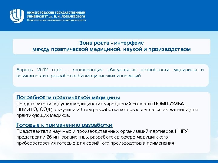 Зона роста - интерфейс между практической медициной, наукой и производством Апрель 2012 года - конференция «Актуальные потребности медицины и возможности в разработке биомедицинских инноваций Потребности практической медицины Представители ведущих медицинских учреждений области (ПОМЦ ФМБА, ННИИТО, ООД) озвучили 20 тем разработка которых является актуальной для практикующих медиков. Готовые к применению разработки Представители научных и производственных организаций-партнеров ННГУ представили 26 инновационных разработок в сфере медицинского приборостроения готовые для серийного производства и применения.