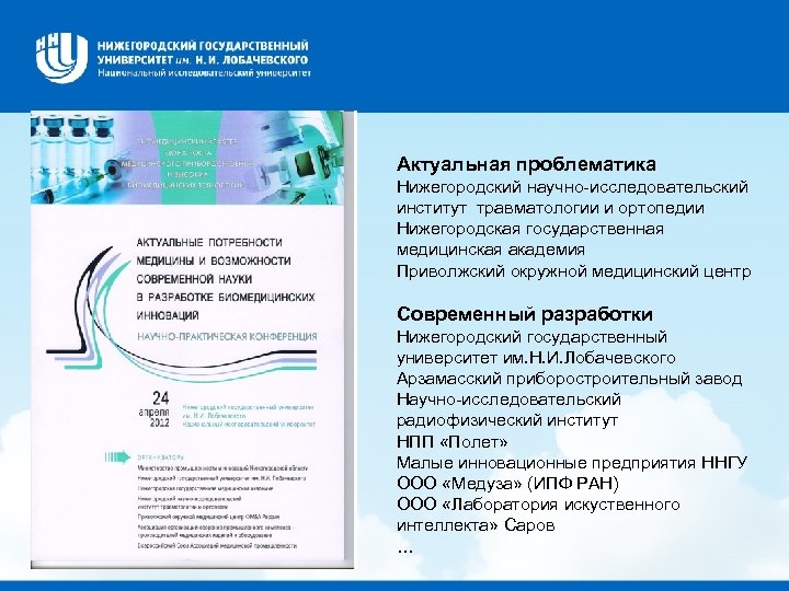 Актуальная проблематика Нижегородский научно-исследовательский институт травматологии и ортопедии Нижегородская государственная медицинская академия Приволжский окружной медицинский центр Современный разработки Нижегородский государственный университет им. Н. И. Лобачевского Арзамасский приборостроительный завод Научно-исследовательский радиофизический институт НПП «Полет» Малые инновационные предприятия ННГУ ООО «Медуза» (ИПФ РАН) ООО «Лаборатория искуственного интеллекта» Саров …