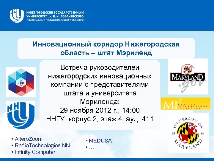 Инновационный коридор Нижегородская область – штат Мэриленд Встреча руководителей нижегородских инновационных компаний с представителями штата и университета Мэриленда: 29 ноября 2012 г. , 14: 00 ННГУ, корпус 2, этаж 4, ауд. 411 • Altero. Zoom • Radio. Technologies NN • Infinity Computer • MEDUSA • …