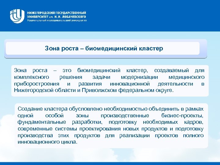 Зона роста – биомедицинский кластер Зона роста – это биомедицинский кластер, создаваемый для комплексного решения задачи модернизации медицинского приборостроения и развития инновационной деятельности в Нижегородской области и Приволжском федеральном округе. Создание кластера обусловлено необходимостью объединить в рамках одной особой зоны производственные бизнес-проекты, фундаментальные разработки, подготовку необходимых кадров, современные системы проектирования новых продуктов и подготовку производства этих продуктов для реализации проектов полного инновационного цикла.