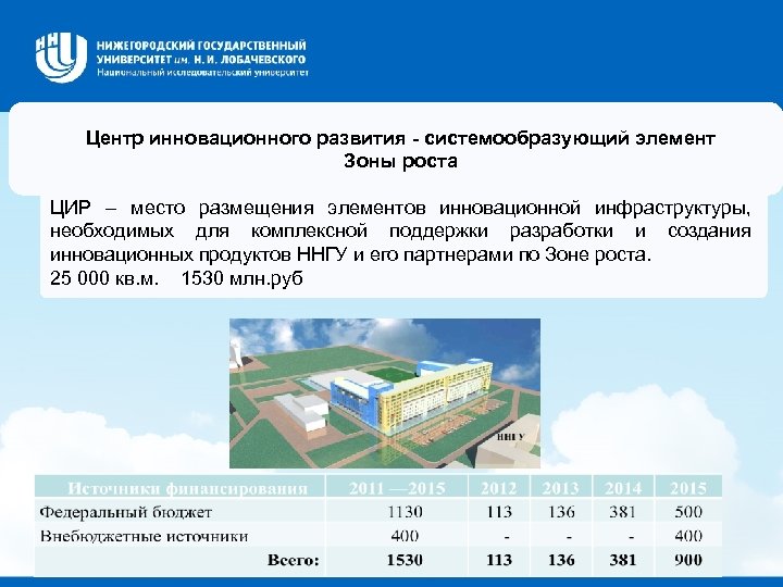 Центр инновационного развития - системообразующий элемент Зоны роста ЦИР – место размещения элементов инновационной инфраструктуры, необходимых для комплексной поддержки разработки и создания инновационных продуктов ННГУ и его партнерами по Зоне роста. 25 000 кв. м. 1530 млн. руб